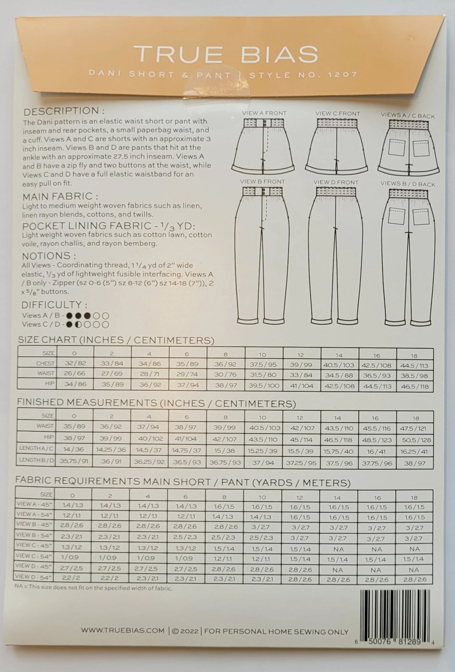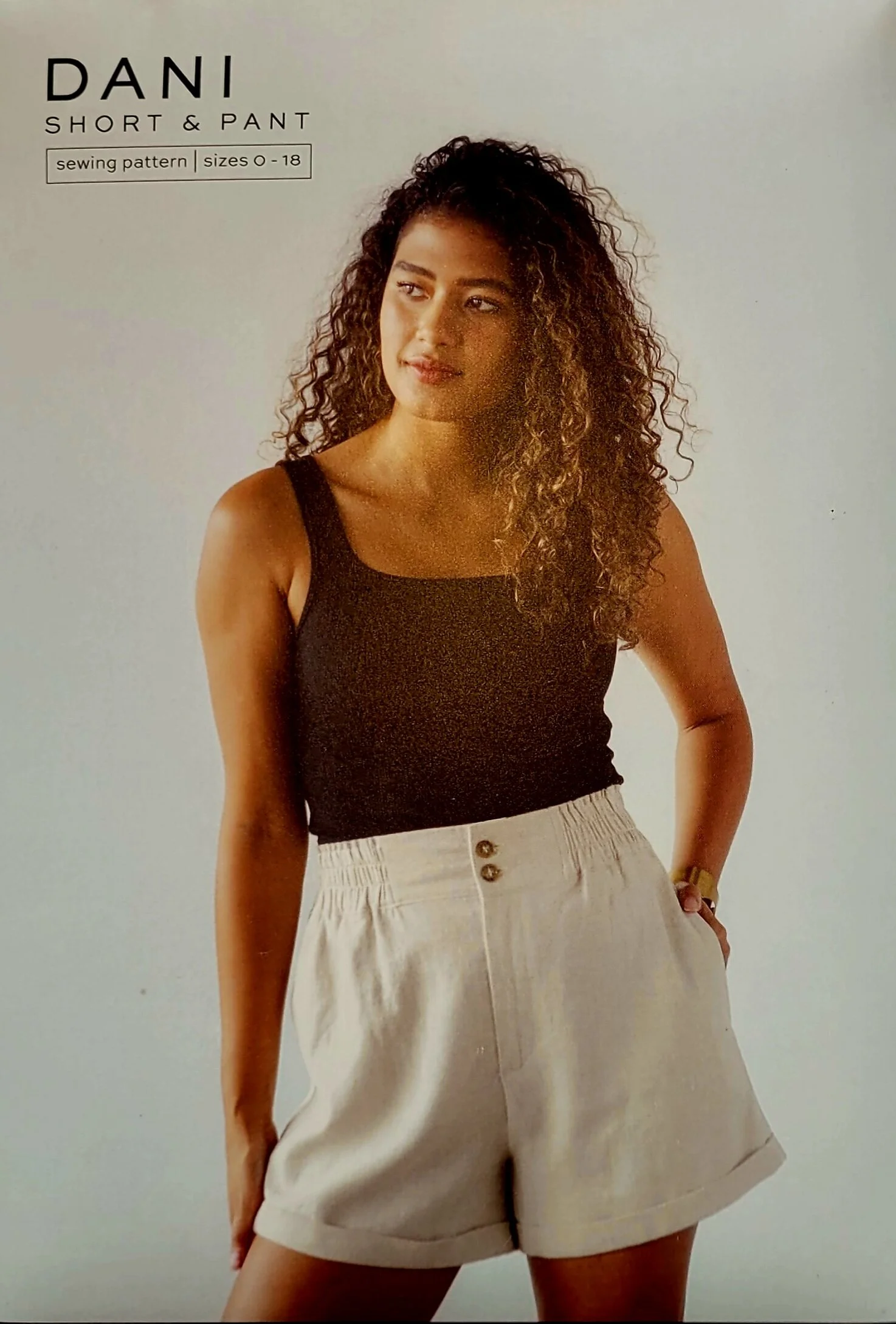 The Dani pattern is an elastic waist short or pant with inseam and rear pockets, a small paperbag waist, and a cuff. Views A and C are shorts with an approximate 3 inch inseam. Views B and D are pants that hit at the ankle with an approximate 27.5 inch inseam. Views A and B have a zip fly and two buttons at the waist, while Views C and D have a full elastic waistband for an easy pull on fit.