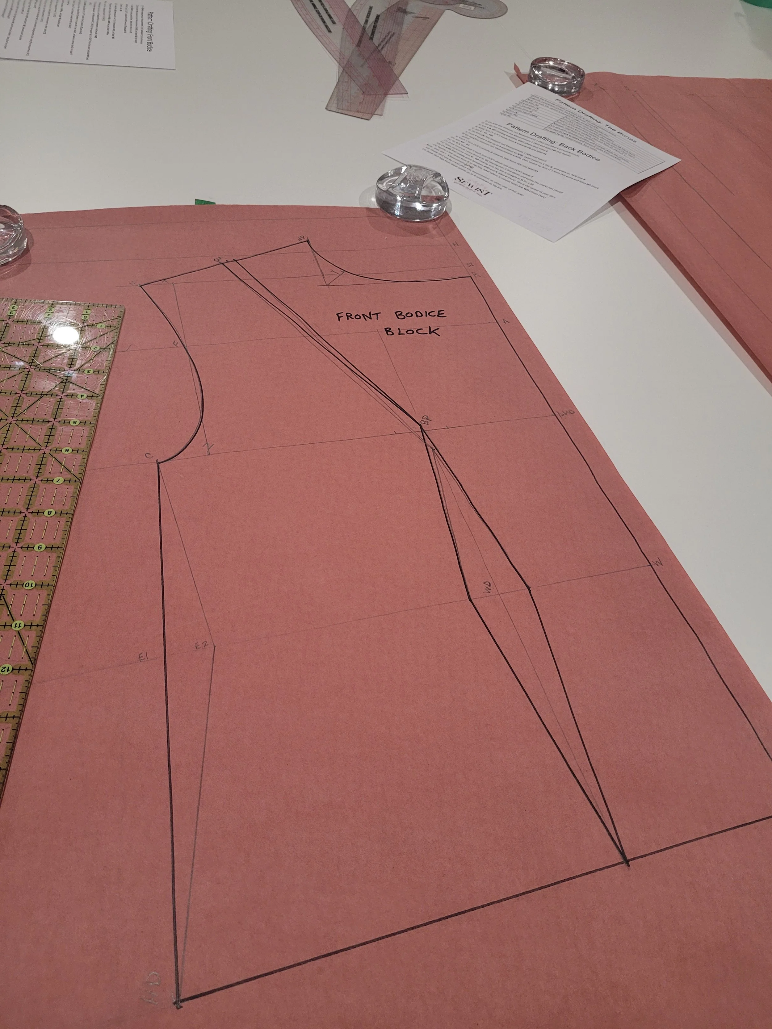 Each workshop is taught in a 7 week series where you will learn how to draft a specific pattern block (bodice/sleeve or pant/skirt), fit it to your body, and make alterations to suit your intended design . The course will focus on three areas of skill building.
